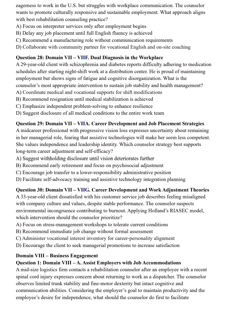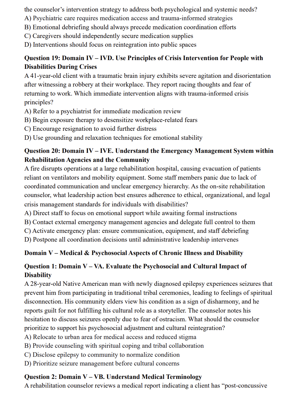 • Provides case-based questions that reflect real-world rehabilitation counseling scenarios